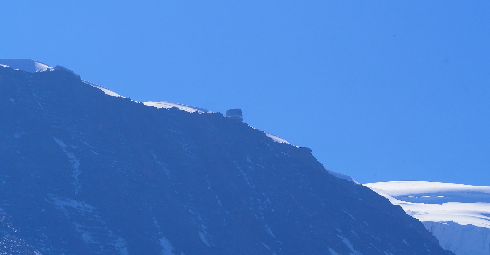 | ビオナセ氷河とドーム・ドゥ・グテー グテー小屋(ズームで) グテー小屋は、死ぬまでに一度は行きたい山小屋だそうです。 |