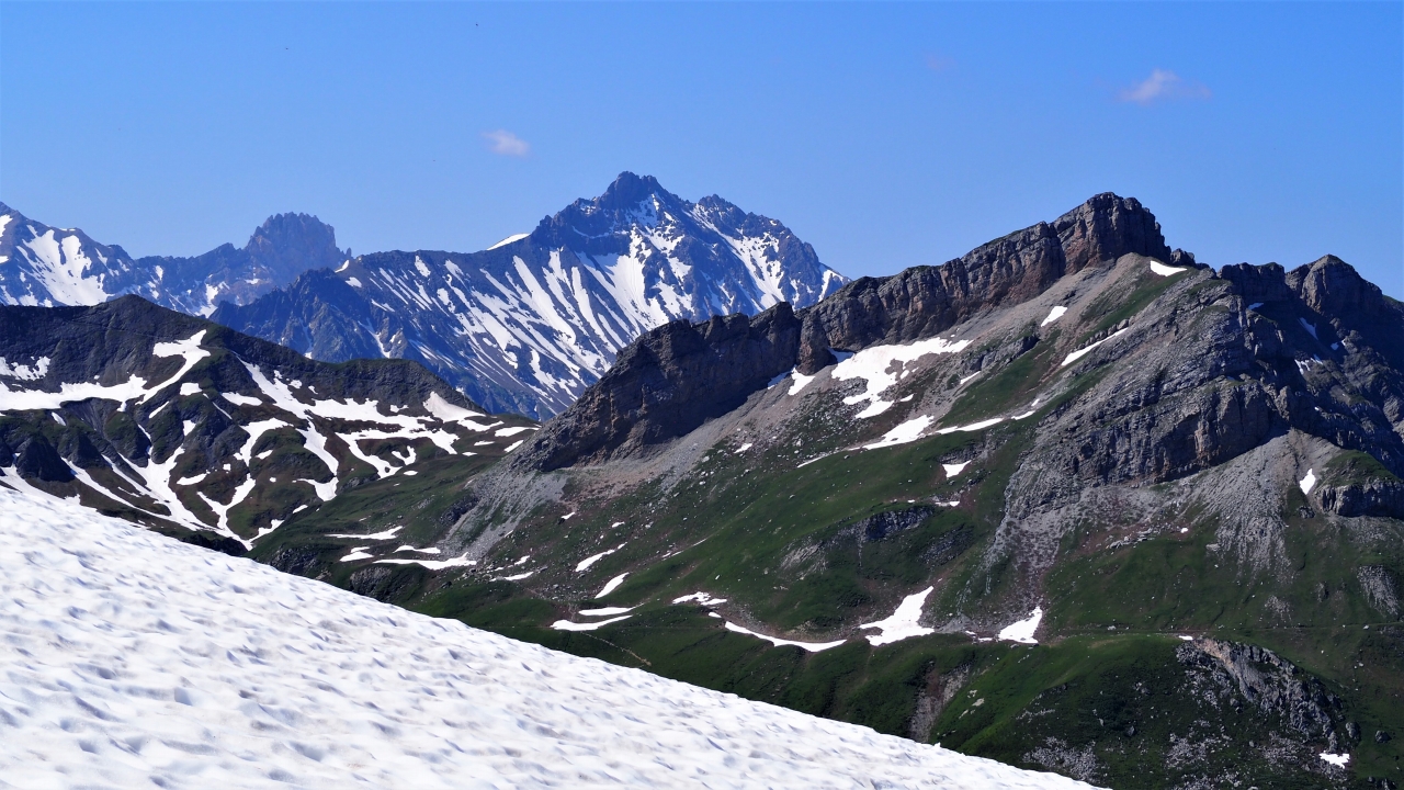 | ボンノム峠周辺には残雪があります 歩いて来たモンジョワ谷 |