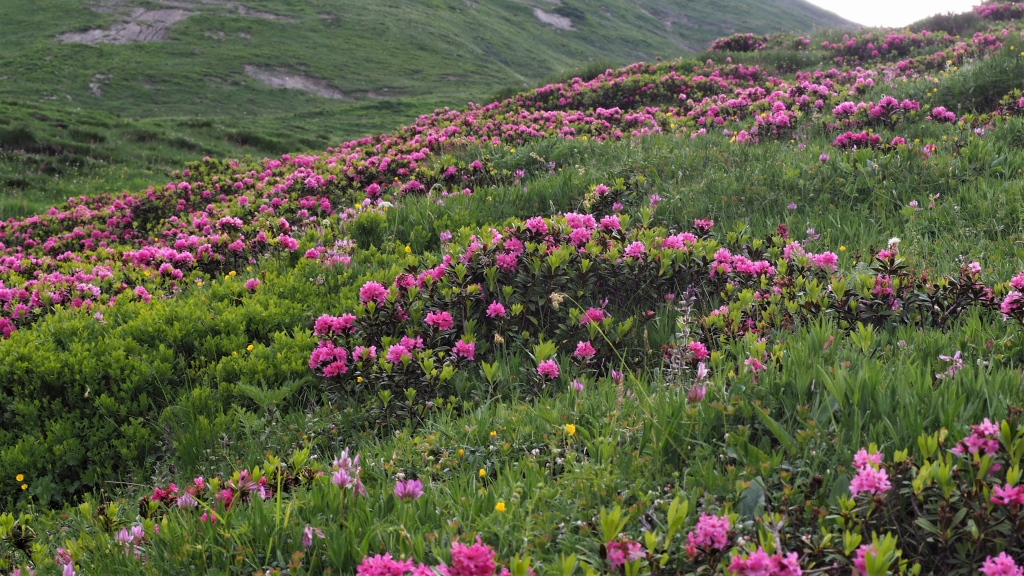 | エレナ小屋 アルペンローゼ エレナ小屋からグラン・フェッレト峠(2537m)へ登ります。 |