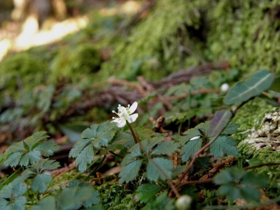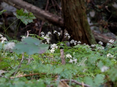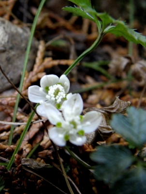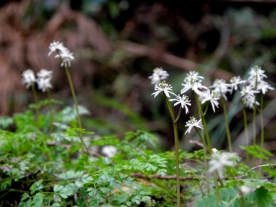 | シコクバイカオウレン 高知の里山で咲くバイカオウレンの花は早ければ12月に咲きます。 今年は2月5日で八分咲きです。 標高の高い所の開花は5月頃となります。 開花時期が長く満開になっても花が咲いた状態で茎が伸びます。 |