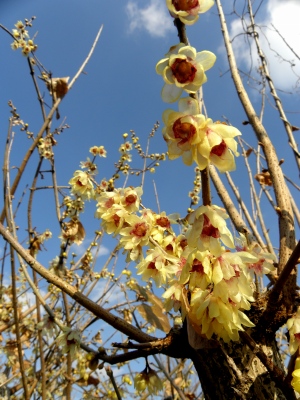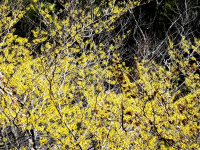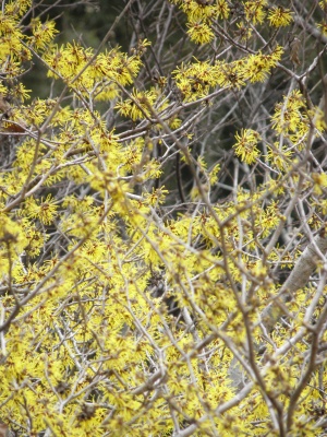 | シナマンサク(植栽) 葉を付けて咲いていますが葉の落ちた所を選んで撮影。 |