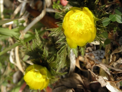 | フクジュソウ(植栽) シロバナタンポポ フクジュソウは植栽と思われます。 高知県では大豊の福寿草祭が今年は2月9日から3月9日まで開催されています。 |