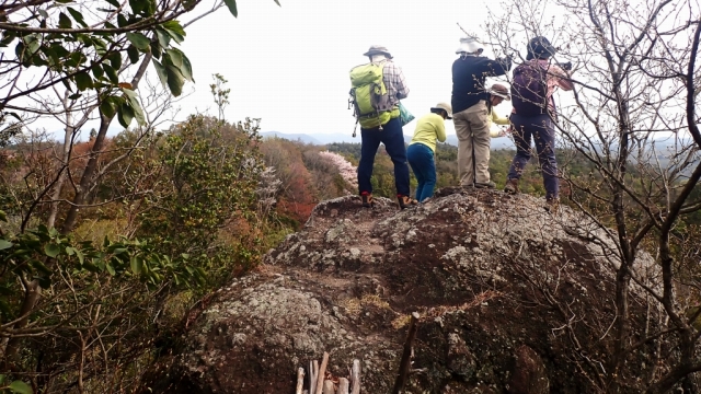 | 行動 南国市役所6:30⇒邑久町豊原釣り公園駐車場8:45 釣り公園8:53〜大雄山登山口9:00〜大雄山9:28〜大賀島寺9:42〜宝蔵岩10:18〜落羽松の森10:43 〜雀岩10:58〜雄久山11:30〜長谷峠兎角桜11:38/11:50〜長谷山11:58〜ダンガメ山12:05/(昼食) |