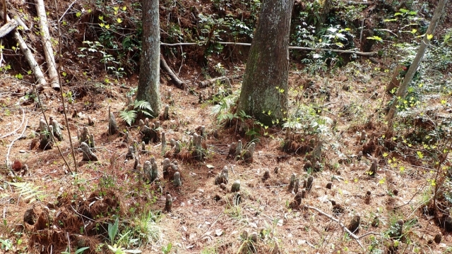 | ラクウショウの気根。 ラクウショウの気根は、湿地に根を張っている根の 成長に必要な酸素を供給するという役割を持っている。 |