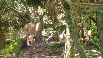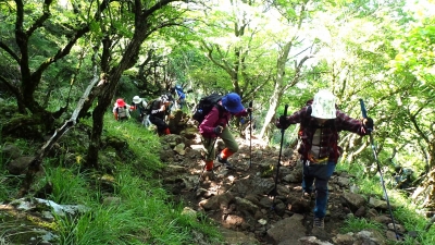 | 九十九折れの登山道を下山中 合野越で見かけた鹿 九十九折れの登山道で先に下山したグループに追いつき一緒に下山しました。 |