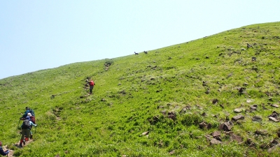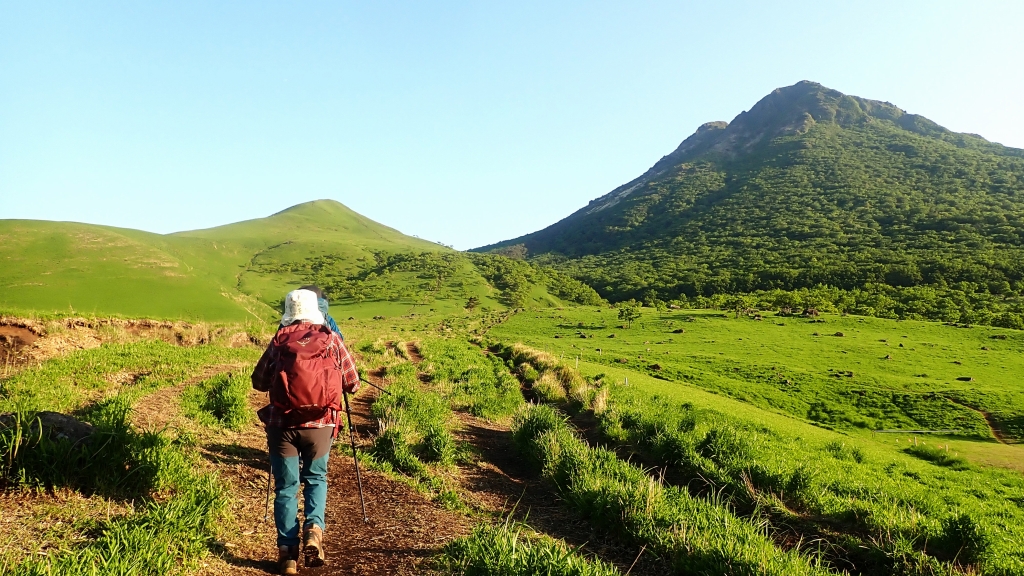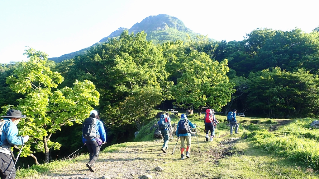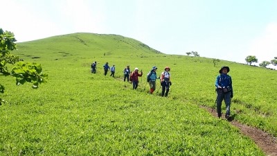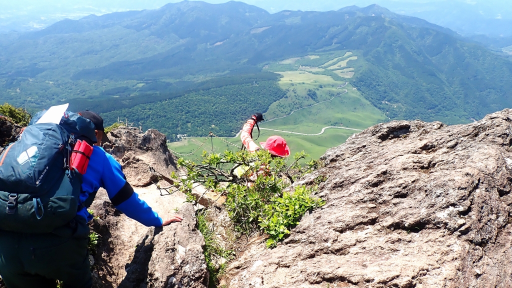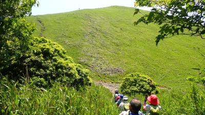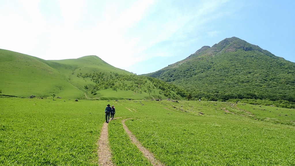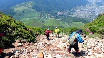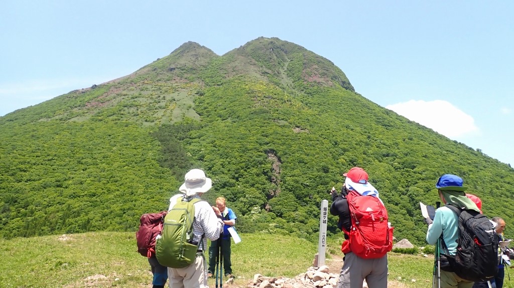 | マタエから下山中の東峰に登ったグループ。 由布岳は、有名な東と西の双耳峰です。 |
