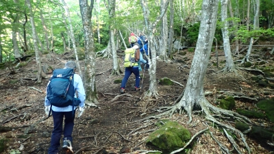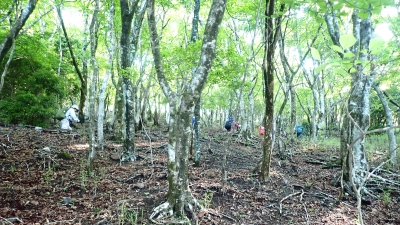 | 笹原を登り小休止 樹林帯 樹林帯に入ると鹿の食害でしょうか下草は殆んど有りません。 |