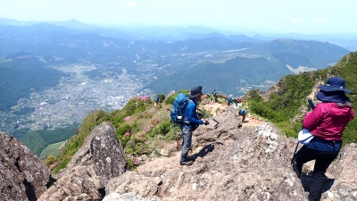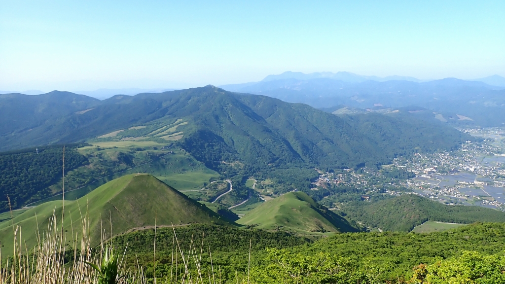 | 九重連山 飯盛ヶ城右は由布の町 標高を上げると樹林帯から灌木に変わり視界が開けます。 |