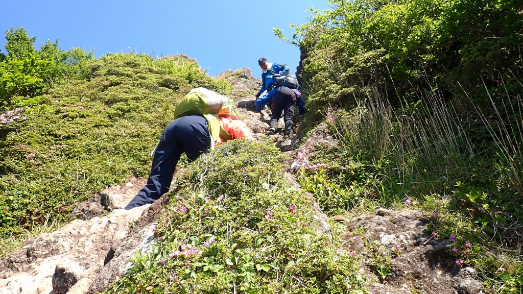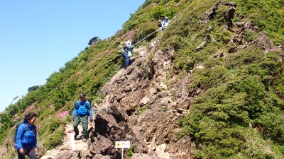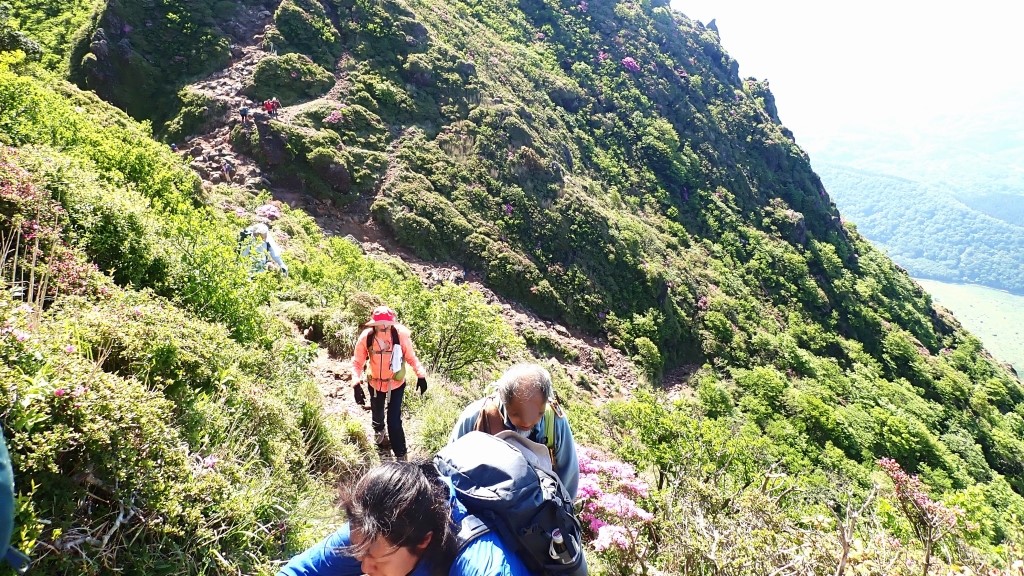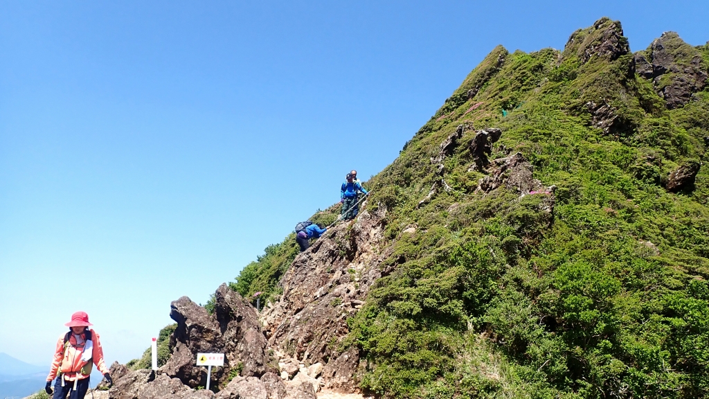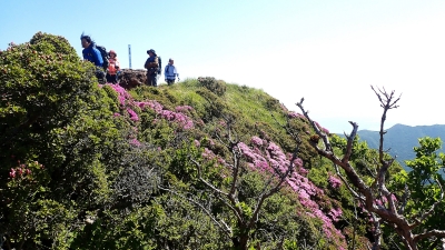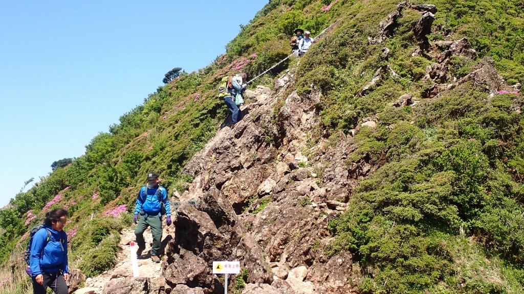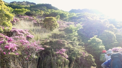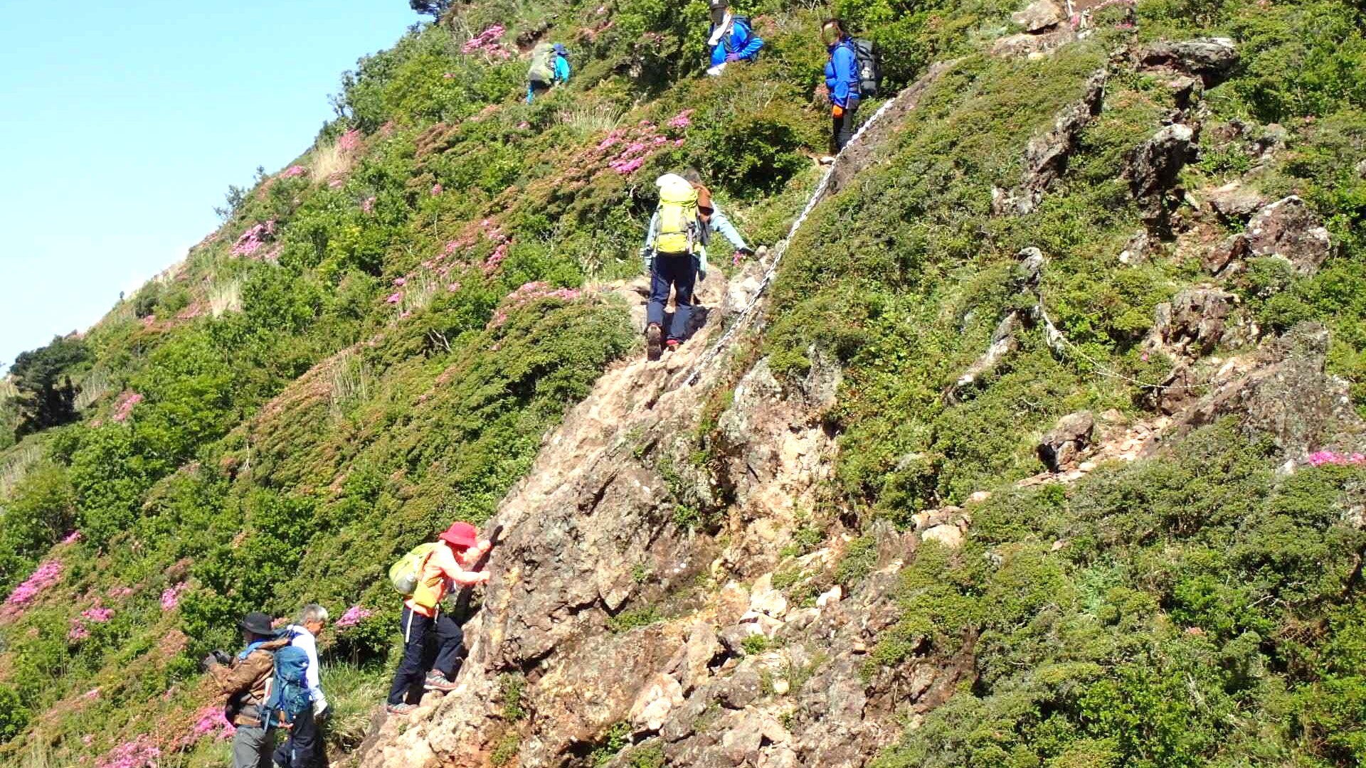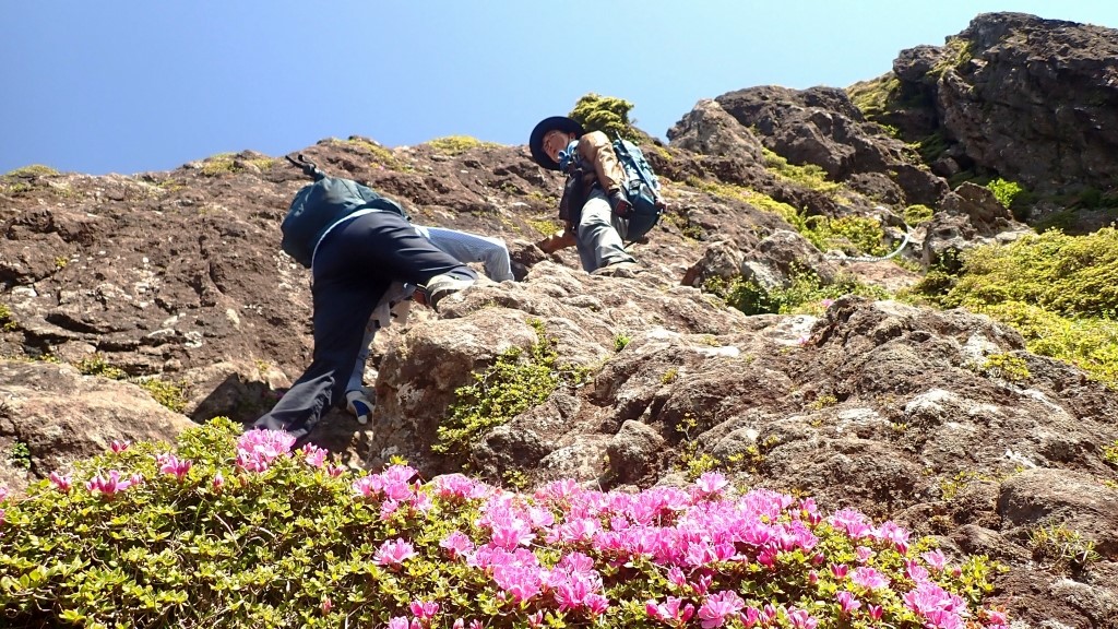 | ミヤマキリシマ咲く岩場を下山中。 | |
