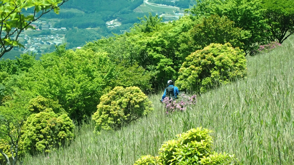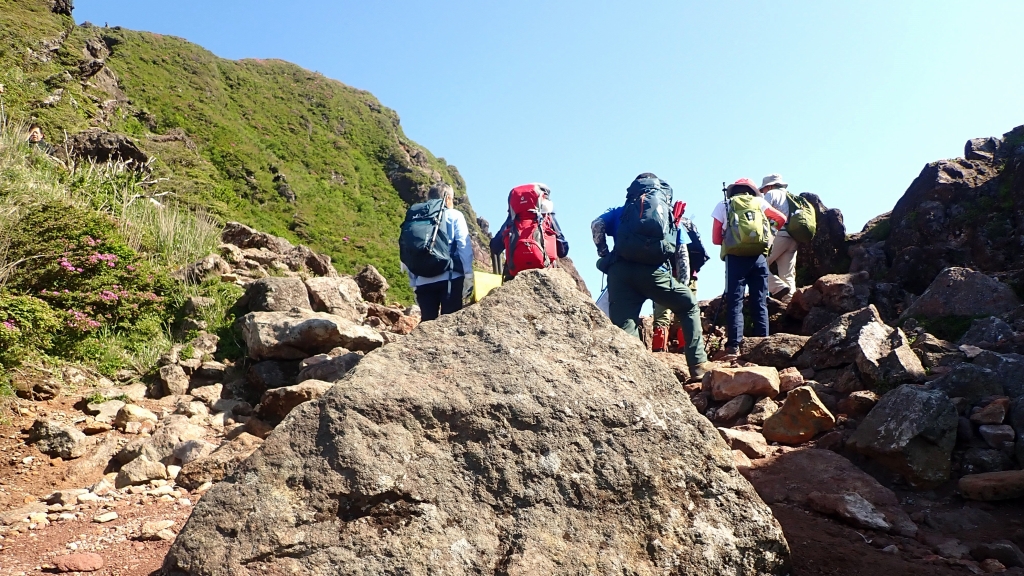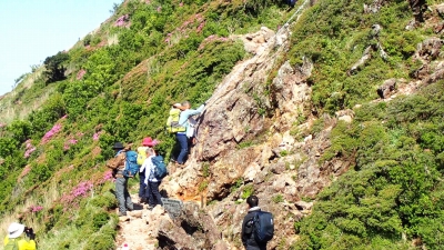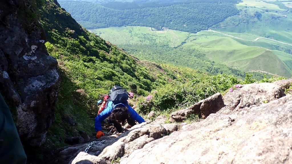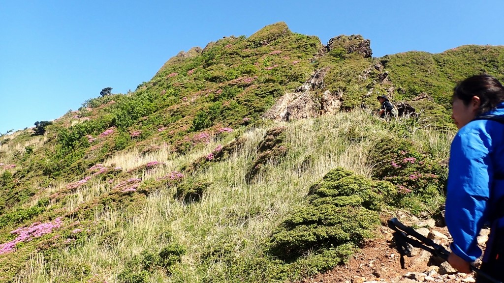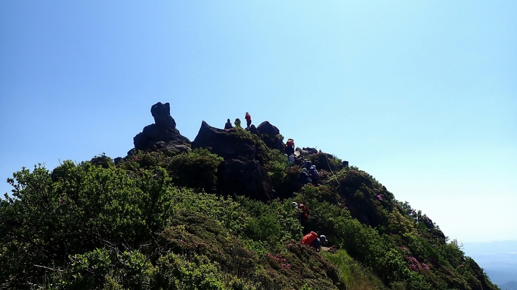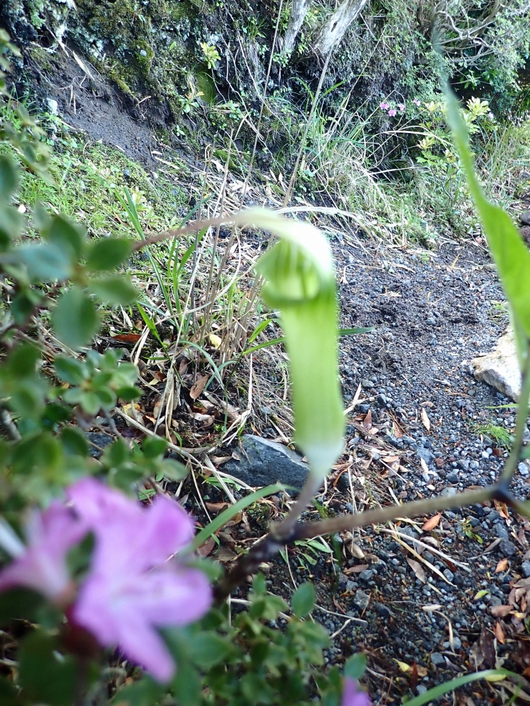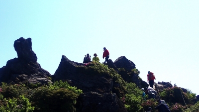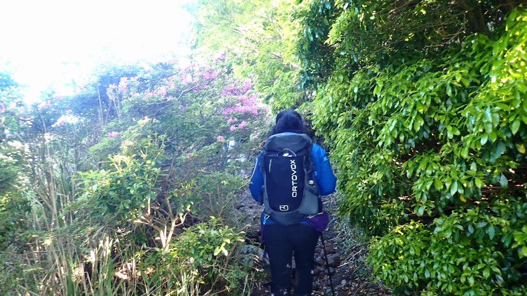 | ミヤマキリシマ咲く岩場を下山中。 | |