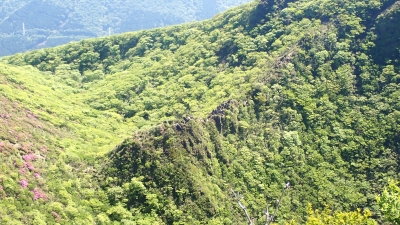 | 切り立つお鉢のエッジ ミヤマキリシマを入れ東峰 今回お鉢巡りは予定にはいれていません。 |