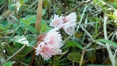 | ギンラン バイカイカリソウ 登山道脇には、鹿の食害から逃れ矮化したギンラン、 キンラン、バイカイカリソウ等が細々と咲いていました。 |