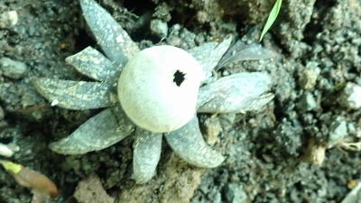 | ショートカットする会員 ツチグリ発見 登山道は、九十九折れのジグザグで藪を下れば近道になります。 |