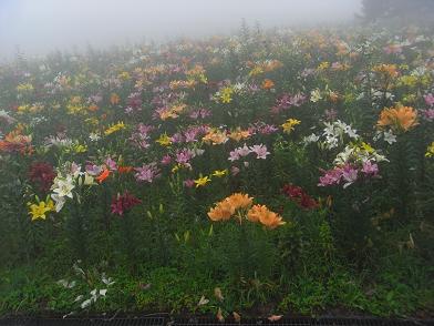 白のゆりっていいと実感 ピンク 白樺とゆり 斜面を覆う〜〜。天気であればなんぼか美しかろうとおもった。だってスキー場がゆり園になっているのだから全部みられる。 リフトの上からみるのもよし、リフトに乗ってあがりつつみるのもよし〜 広大なのは当たり前の場所です。 パンフレットに出ていたゆりの名前を少しだけ列挙 アビニオン・カプレット・ブルネロ・モナ・サムール・ミュージック・クーリア すかしゆり系 アカプルコ・ソルボンヌ・ビサベルサ・レガタ・ルレープ・トライアンフェター ハイブリッド系 見て花と名前がくっつくのは6種しかありませんでした。 西日本最大級をほこるゆりの楽園 ‘‘360万輪のゆりの競演 ”を楽しみませんかとパンフレットにありました。 吹田JCTから3時間だそうです。 来年も植えつけるそうですのでできたら見に来たいと願いつつ後にしました。 開園期間は今年は7月11日〜8月31日(予定)とのこと。 私達が見たのは早咲きの品種だったそうです。